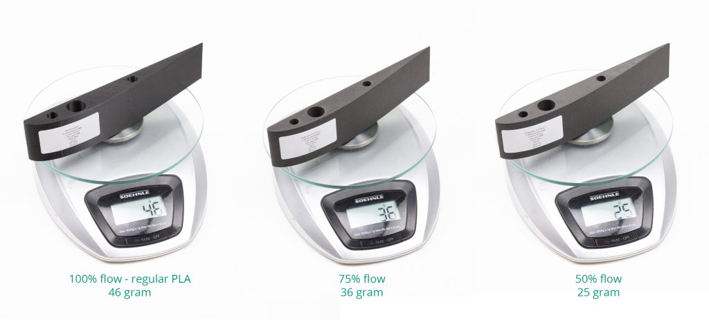 Left: Standard PLA with 50% infill and normal settings. Right: colorFabb LW-PLA with 50% infill, printed at 255°C and a flow rate of 35%.